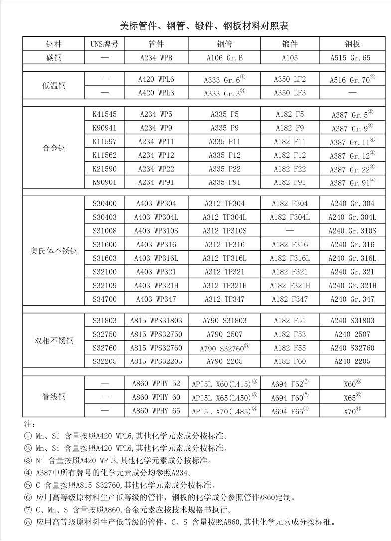 ASTM-美標管件、鋼管、鍛件、鋼板材料對照表