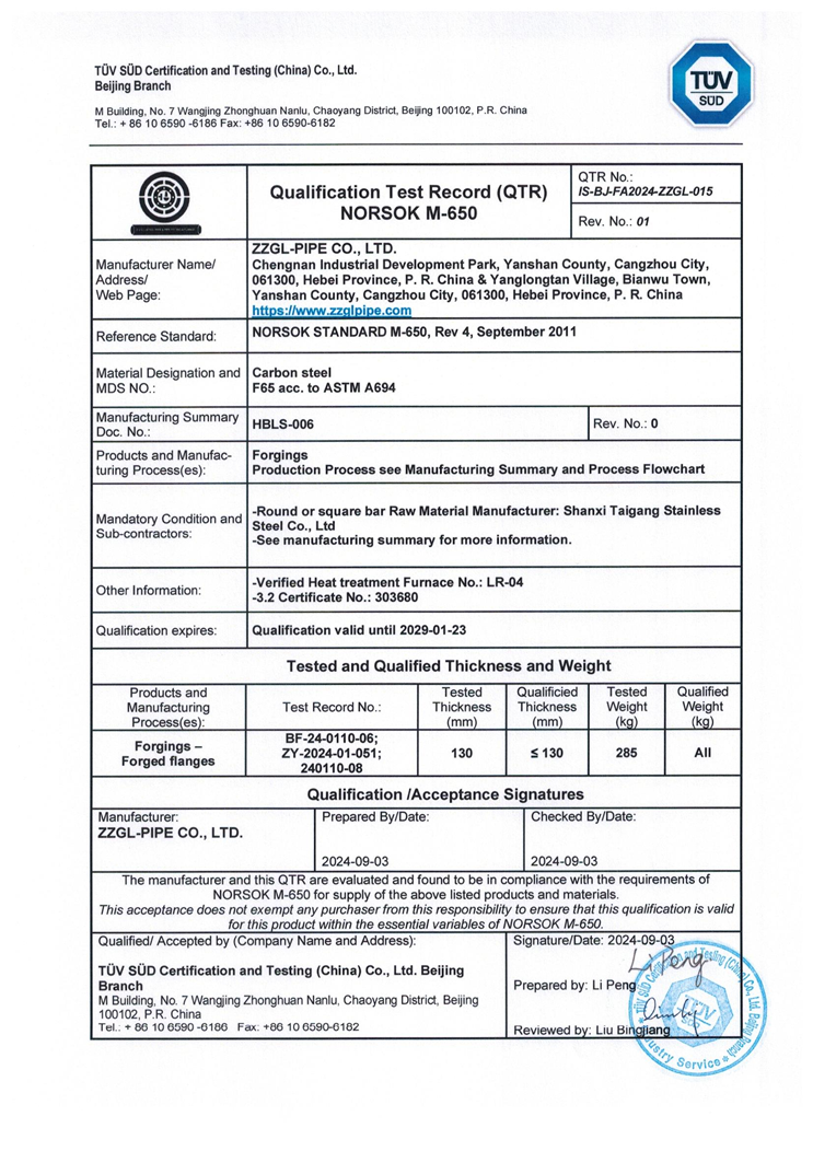 公司已取得:NORSOK M-650 ASTM A694 F65材質鍛件的挪威國家石油標準認證。