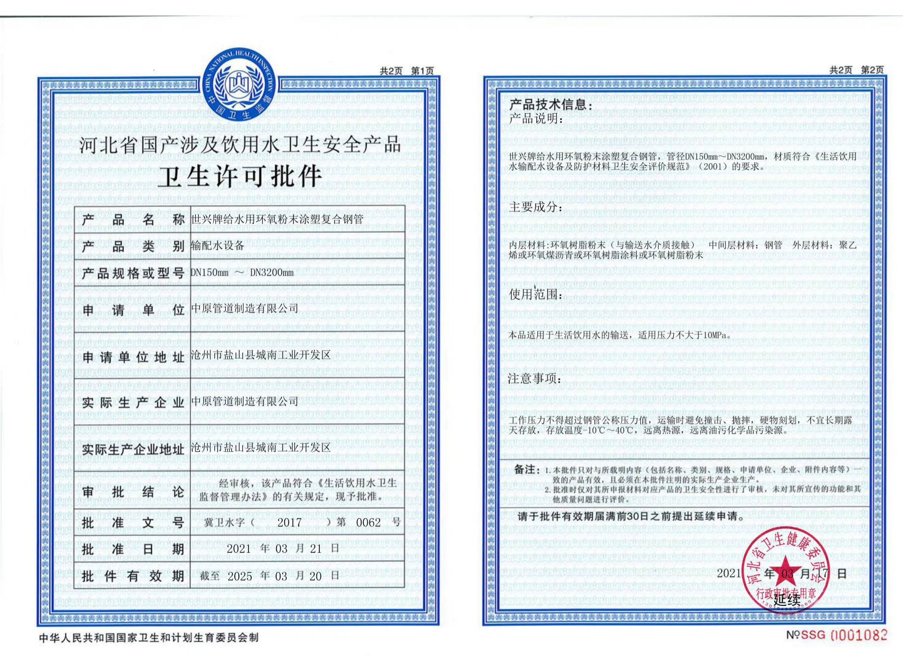 給水用環粉末塗塑複合鋼管-飲用水衛生安全樱花草黄色电影-衛生許可批件