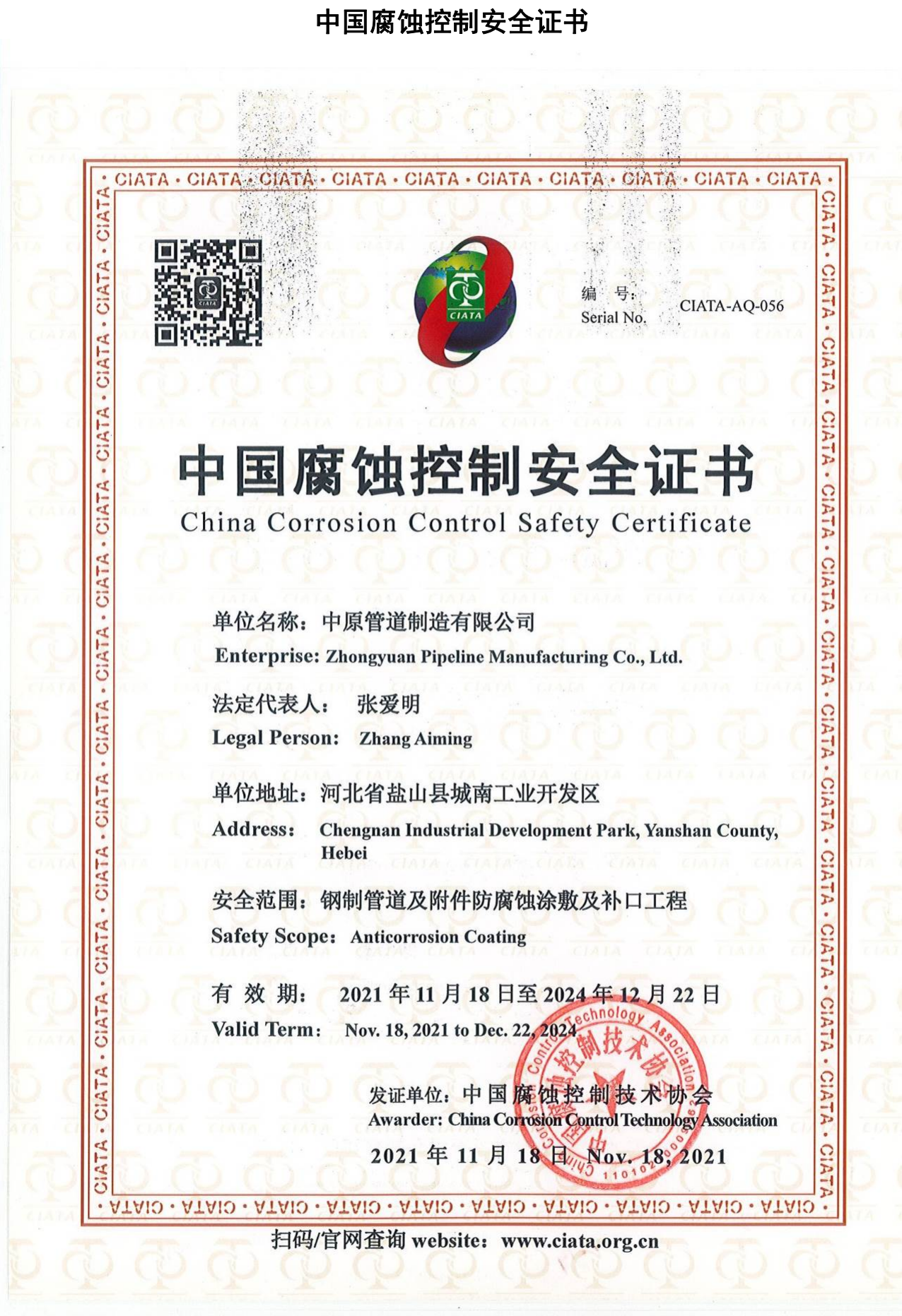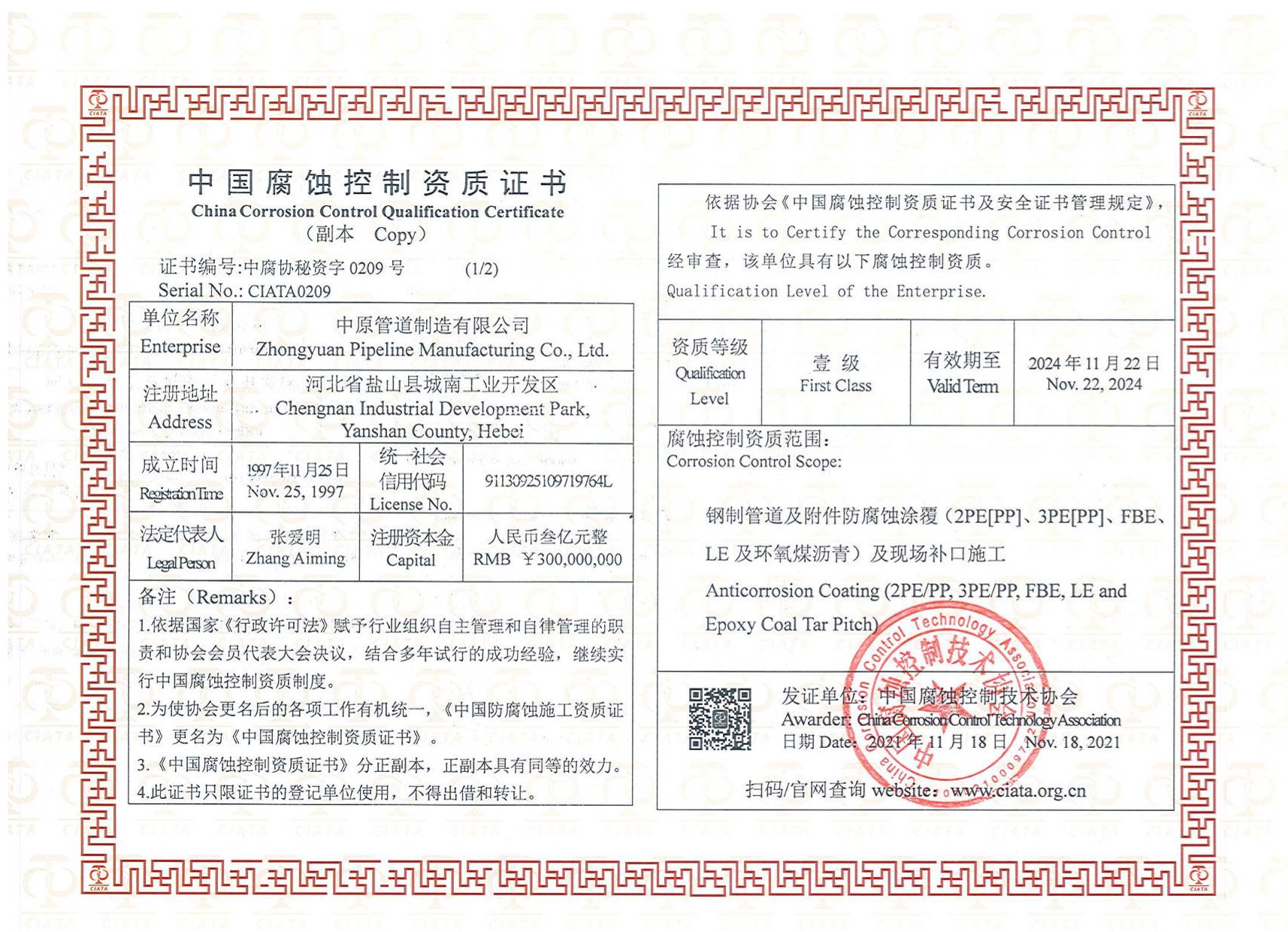 環氧煤瀝青鋼製管道及附件防腐蝕塗資質證書