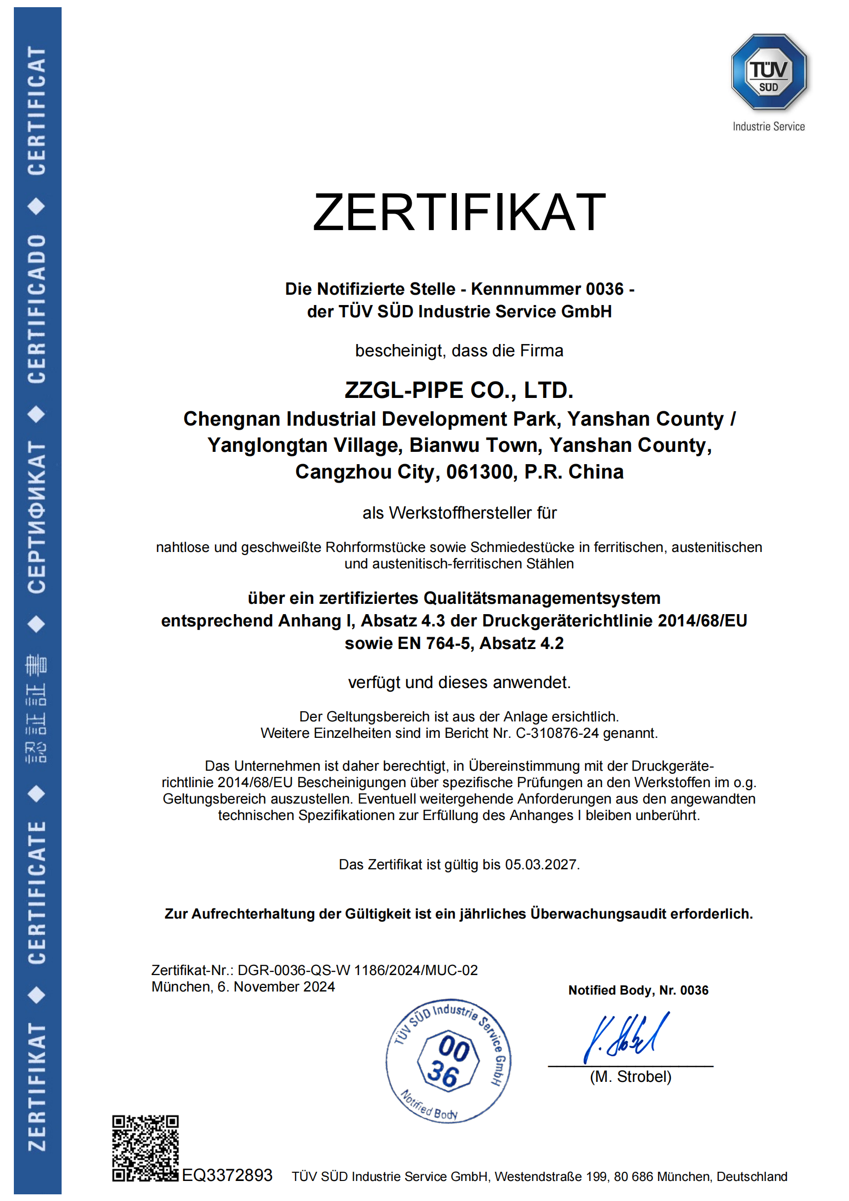 根據TUV作為ASTM A182 Forgings F91材料製造商的審核範圍,符合PED 2014/68/EU Annex l, Section 4.3:資質認證詳看下方認證證書