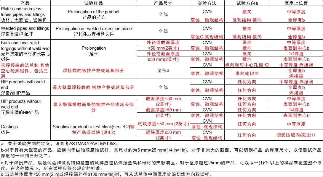 The test samples shall be made from a sacrificial product or from a prolongation/extension of a product in the final solution annealed condition with locations of test specimens as defined in Table 1 representing the thickest product within the lot.Alternatively,a representative test block may be used when agreed with the purchaser.