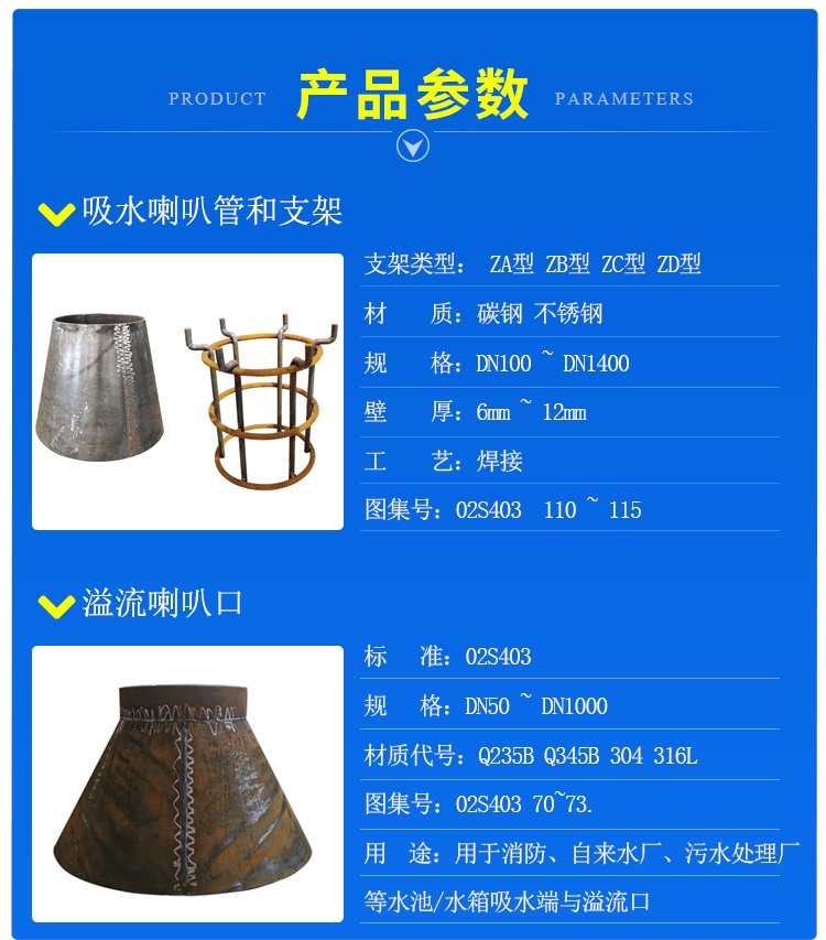 吸水喇叭口,入口處的直徑要大於管道直徑,形象點喇叭口形狀類似於大小頭,直徑較小的一端和管道直徑相同。