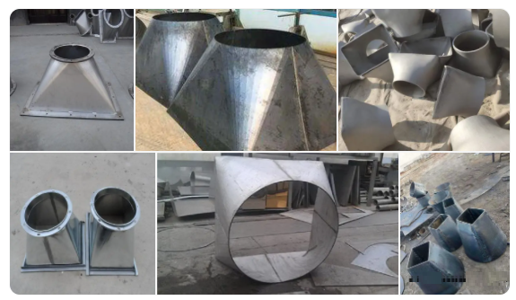 方圓節簡介從分析理想的一般方圓節結構特性入手,提出了一般方圓節手工放樣的一種改進方法,該方法不用細分“天圓”麵的圓弧來近似求解放樣,而是直接畫出圓弧放樣線;推算出了一般方圓節的理論麵積計算公式和提出了如何計算改進方法的放樣麵積,從而可以定量地知道放樣的精度; 天圓地方形狀有平底形、曲麵形(球形、拋物線形等)和錐形,幾種常見的翻邊凸模的結構形狀,圖中凸模直徑段為凸模工作部分,凸模直徑段為導正部分,1為整形台階,2為錐形過渡部分,其中:帶導正銷的錐形凸模,當豎邊高度不高、豎邊直徑大於10時,可設計整形台階,相反可不設整形台階,當翻邊模采用壓邊圈時也可不設整形台階;一種雙圓弧形無導正銷的曲麵形凸模,當豎邊直徑大於6時用平底,豎邊直徑小於或等於6時用圓底;帶導正銷的豎邊直徑小於4時可同時衝孔和翻邊的凸模。此外,還有用於無預製孔的帶尖錐形凸模。凸、凹模尺寸可參照拉深模的尺寸確定原則確定,隻是應注意保證翻邊間隙。凸模圓角半徑越大越好,好用曲麵或錐形凸模,對平底凸模一般取≥4。凹模圓角半徑可以直接按工件要求的大小設計,但當工件凸緣圓角半徑小於小值時應加整形工序。