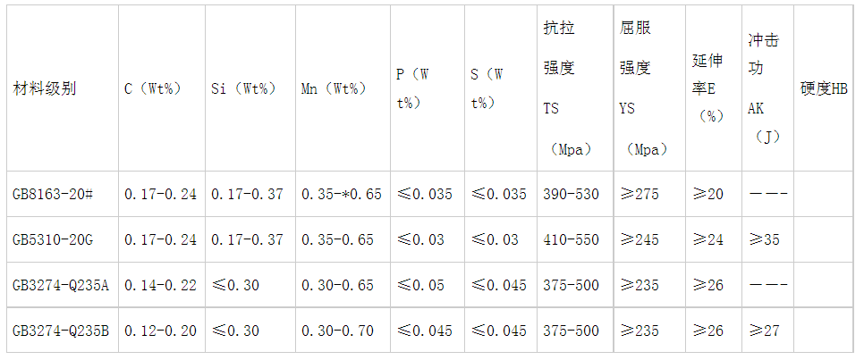 目前碳鋼對焊管件,國內製造標準比較繁多,主要涉及國家標準GB12459、GB/T13401及行業標準,如:SH3408 、SH3409、HG/T21635 、HG/T21631以及電力、石油等行業標準,但從其使用材料的類別來分,不外乎兩類,一類用於製造無縫管件的無縫鋼管類,另一類用於製造焊縫管件的鋼板類。最常用的這兩類材料的標準見表1,其中用於碳鋼對焊管件的典型材料為:GB8163-20#、GB5310-20G 及 GB3274-Q235A、Q235B,這幾種材料的主要化學成份及機械性能標準要求見表2。
