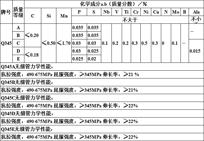 Q345A級,是不做衝擊;Q345B級,是20度常溫衝擊;Q345C級,是0度衝擊;Q345D級,是-20度衝擊;Q345E級,是-40度衝擊。在不同的衝擊溫度,衝擊的數值也有所不同。在板材裏,屬低合金係列。在低合金的材質裏,此種材質為最普通的。Q345過去的一種叫法為:16Mn。