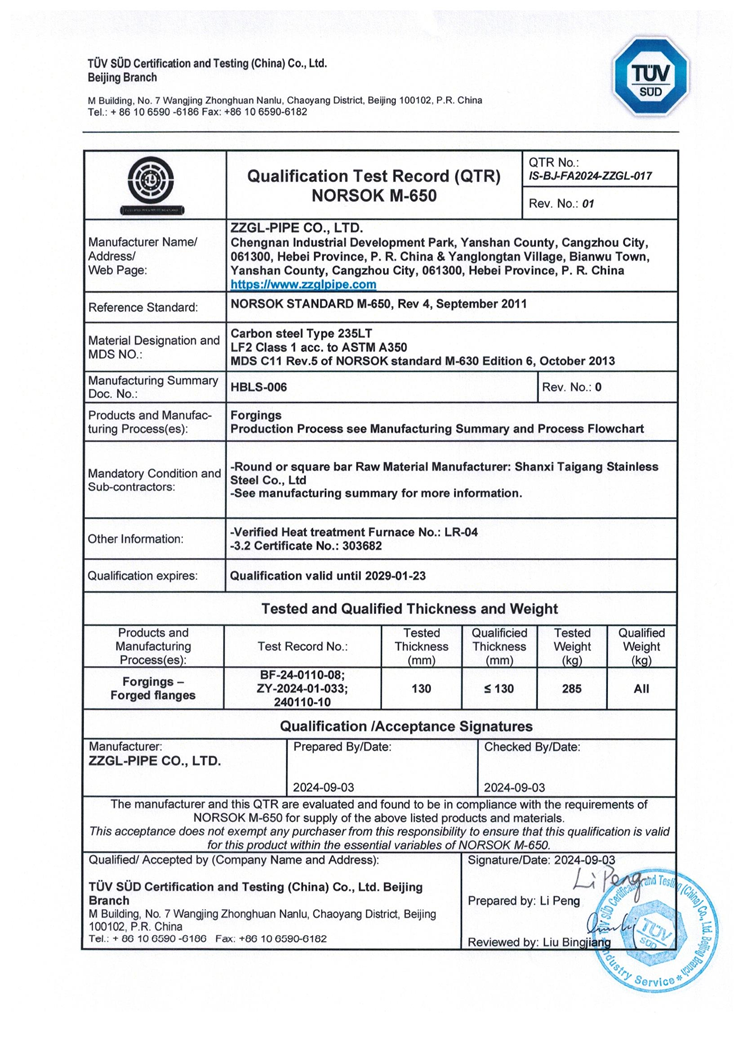 公司已通過挪威國家石油標準NORSOK M-650 ASTM A350 LF2認證。